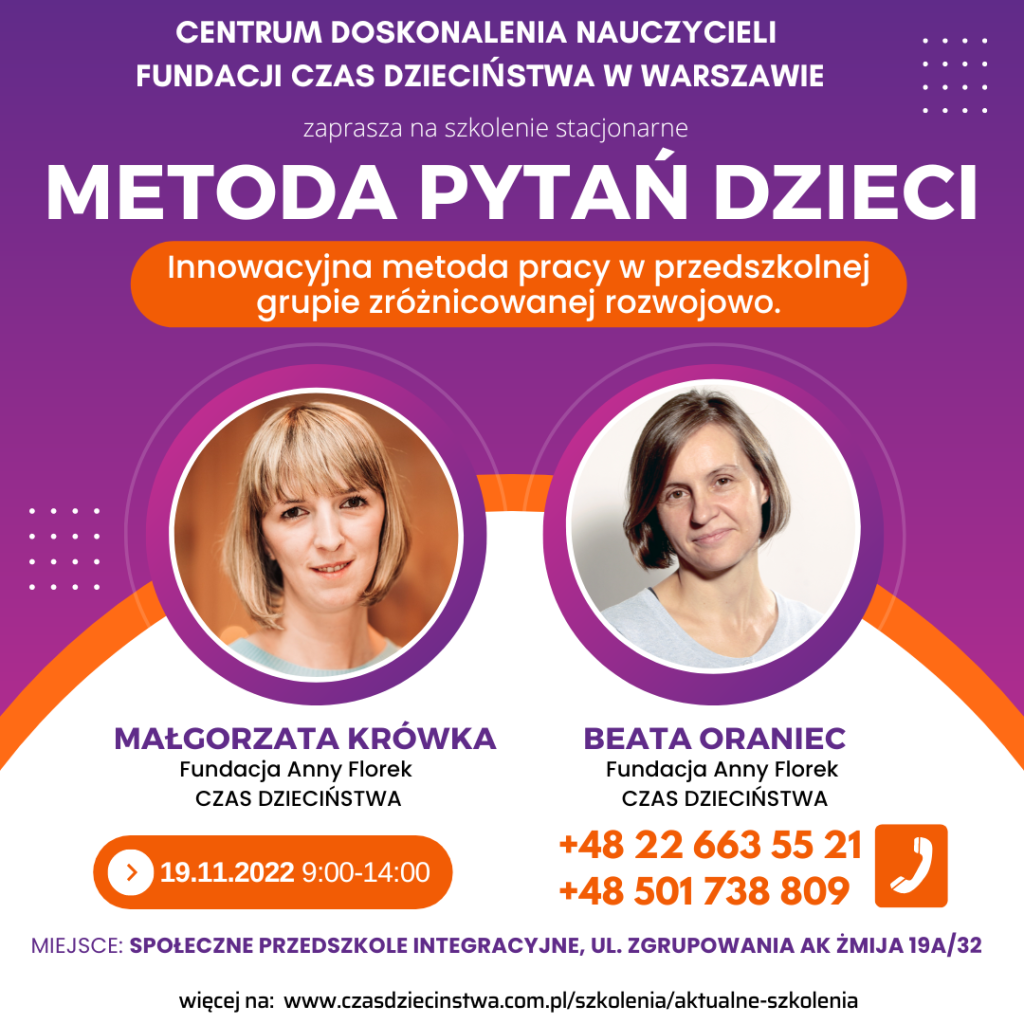 zaprasza na szkolenia stacjonarne podczas, którego uczestnicy zdobędą wiedzę i umiejętności dotyczące: założeń programowych „Metody Pytań Dzieci” organizacji zajęć wg wyżej wymienionej metody urządzenia i wyposażenia sali przedszkolnej dostosowań wynikających z Indywidualnych Programów Edukacyjno-Terapeutycznych sposobów dokumentowania potwierdzających realizację treści podstawy programowej Prowadzący: Małgorzata Krówka (wieloletni praktyk, nauczyciel wychowania przedszkolnego, pedagog specjalny) Beata Oraniec (wieloletni praktyk, nauczyciel wychowania przedszkolnego, surdopedagog) Termin: 21 listopada 2022, godz. 16:00-20:00 Miejsce: Przedszkole Fundacji CZAS DZIECIŃSTWA, ul. Wolumen 3 w Warszawie Czas trwania: 5 godzin dydaktycznych Koszt szkolenia: 250 PLN (w cenę wliczone są materiały szkoleniowe, zaświadczenie o ukończeniu szkolenia, kawa, herbata i słodki poczęstunek) Kontakt: telefonicznie 226635521 i 501738809 lub przez formularz kontaktowy (w tytule wiadomości proszę napisać szkolenie).