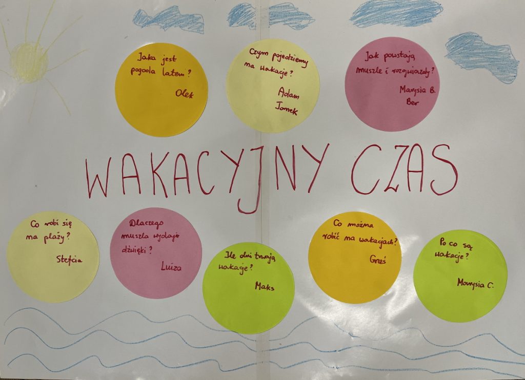 W tym tygodniu realizujemy następujące tematy: grupa 1 : Wakacyjny czas grupa 2 : Na polu i na łące grupa 3 : Na łące i w ogrodzie grupa 0 : Rzeczy Ostatni temat wymyśliły dzieci. Jest to jedyna z 6 propozycji, zaproponowanych przez zerówkowiczów, która w demokratycznym głosowaniu zdobyła 100% poparcia. Plansze z Zapytajkami :