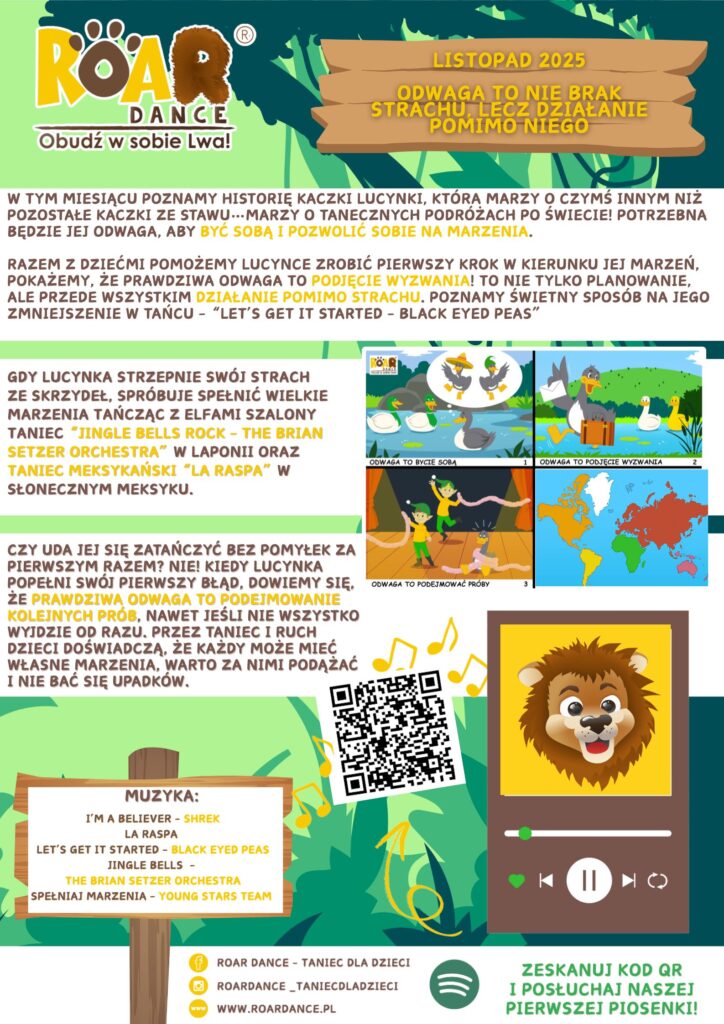 Od września 2024 roku w Społecznym Przedszkolu Integracyjnym prowadzone są zajęcia Roar Dance. Spotkania odbywają w co drugi wtorek i trwają 30 minut. W ich trakcie dzieci tańczą i tym ruchem opowiadają historię, która jest inna podczas każdych zajęć. W każdym miesiącu opowieść ma innych cel i charakter. Poniżej przedstawiamy informacje o tematach zajęć, a także o wspierającej je muzyce.