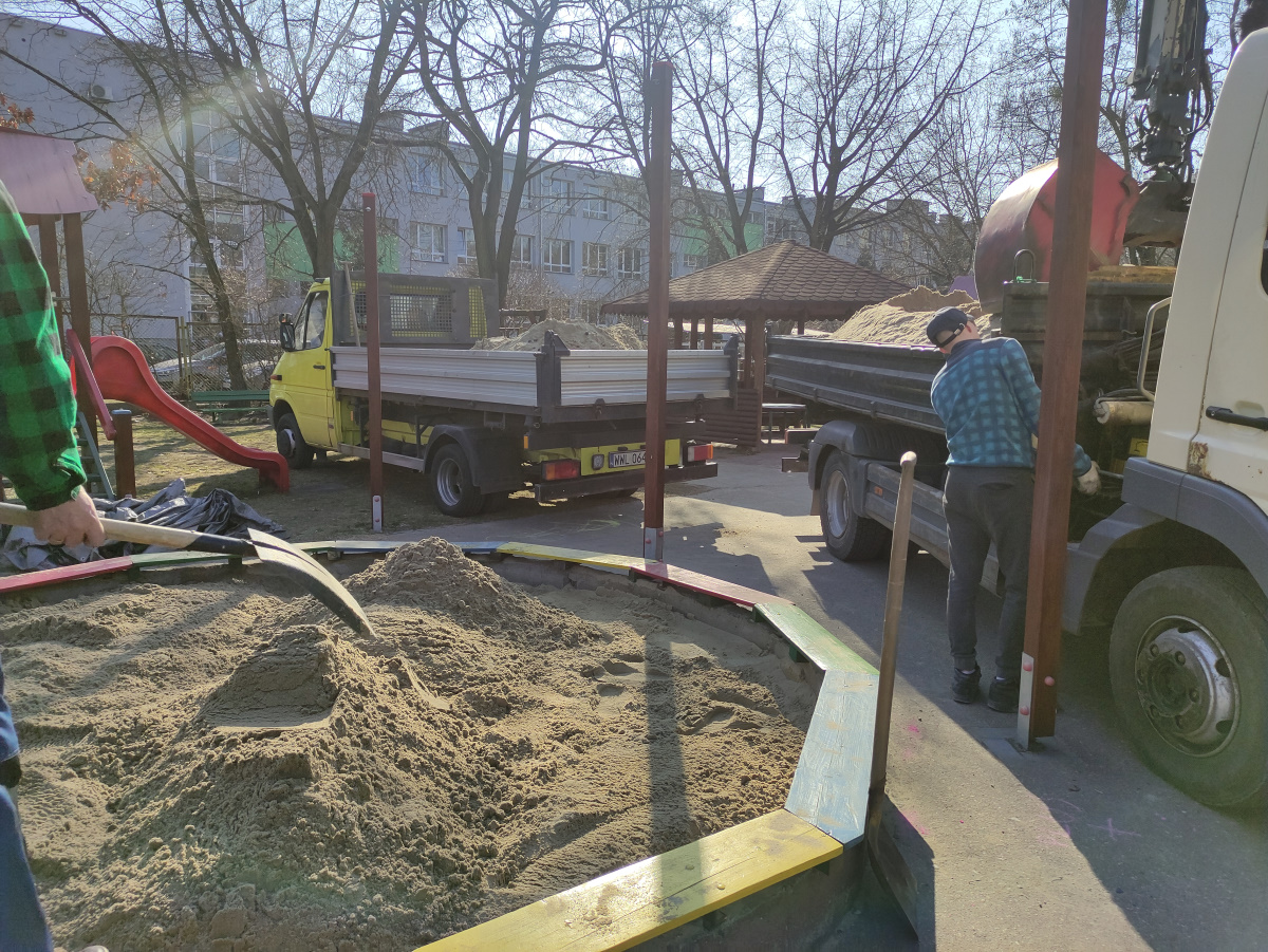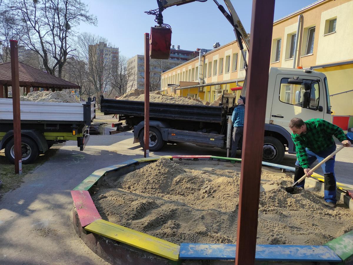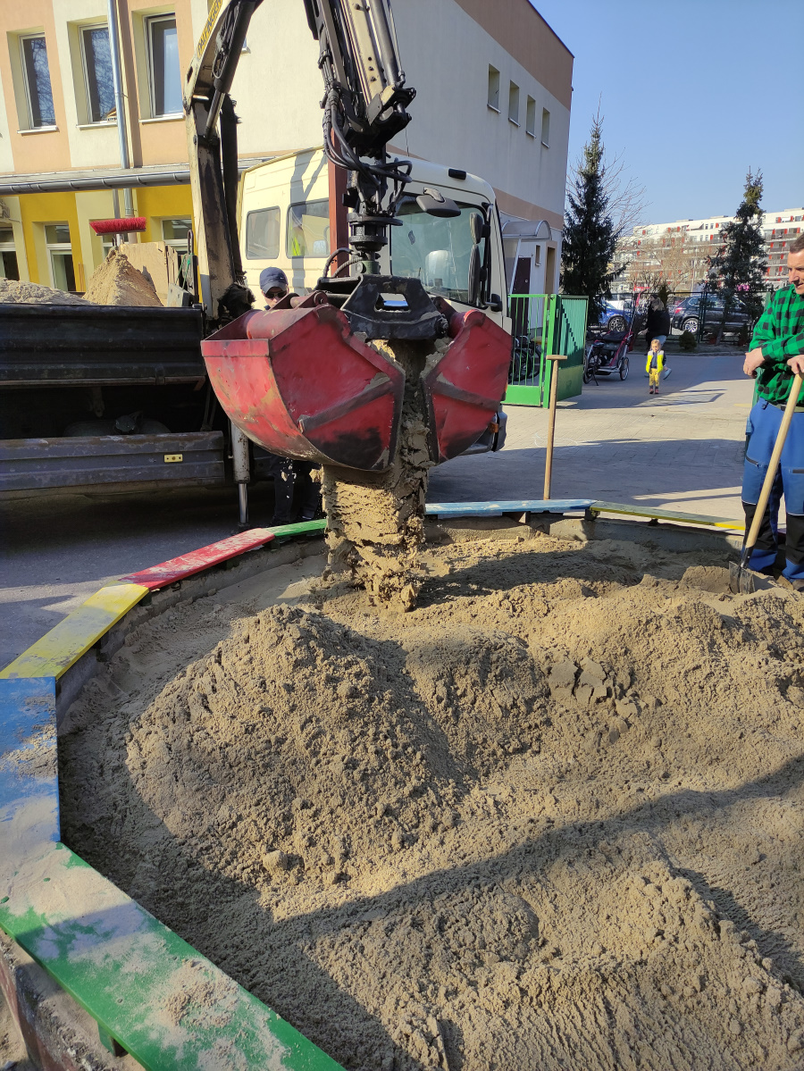 Pierwszy dzień wiosny w przedszkolu to nie tylko piękna pogoda i koncert muzyki klasycznej związany z tą porą roku. To również wymiana piasku w naszej piaskownicy. Niby prosta czynność, ale przykuła uwagę dzieci z zerówki i pierwszej grupy (bo te przedszkolaki mają taras najbliżej piaskownicy). Największą atrakcją była oczywiście pracująca koparka. Najpierw zbierała ona zeszłoroczny piasek na ciężarówkę a potem ładowała nowy. Jako, że wokół piaskownicy umieszczone są belki podtrzymujące żagiel przeciwsłoneczny, to operator koparki musiał naprawdę wysoko unosić jej ramię i łyżkę. Nie uszło to uwadze najstarszych przedszkolaków. A od jutra będziemy szukać muszelek, bo zawsze po wymianie piasku jest ich najwięcej.